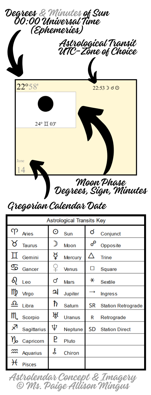 The Astrolendar is a way of traveling through your year following the Sun as it cycles around the astrological wheel. The traditional calendar months and days are still featured on the Astrolendar in the lower left corner.