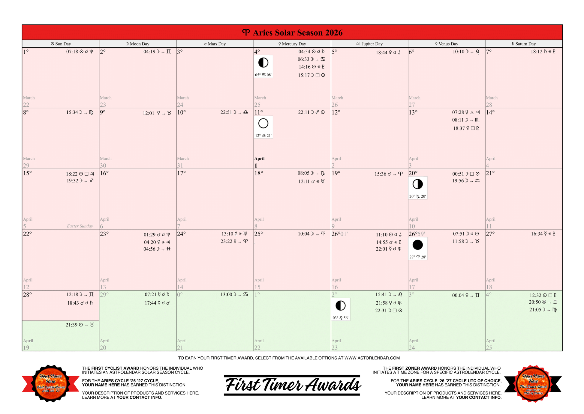 🏆 First Zoner Award: Awarded on all Aries Cycle '26-'27 Astrolendars for your selected Time Zone.