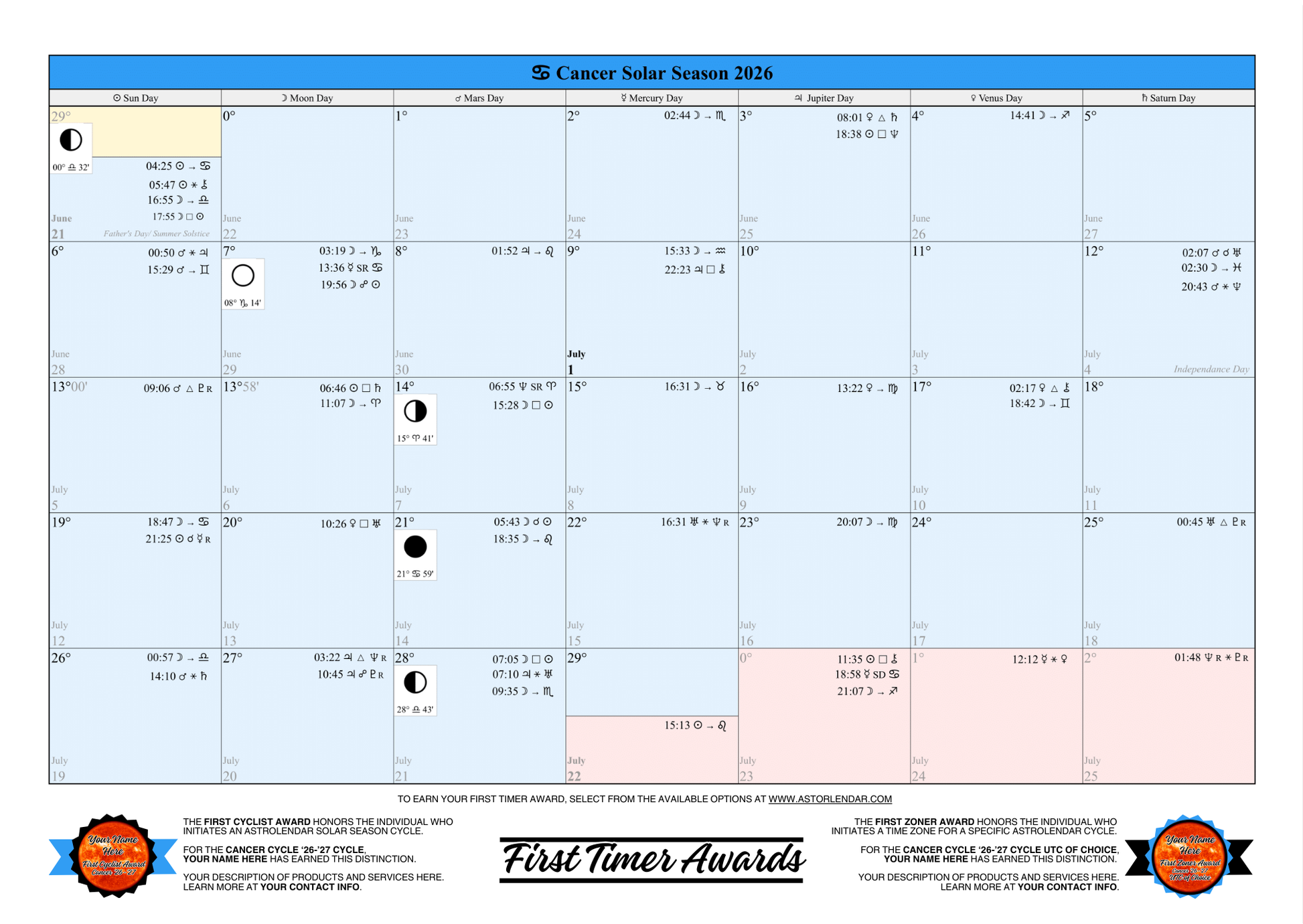 🏆 First Zoner Award: Awarded on all Cancer Cycle '26-'27 Astrolendars for your selected Time Zone.