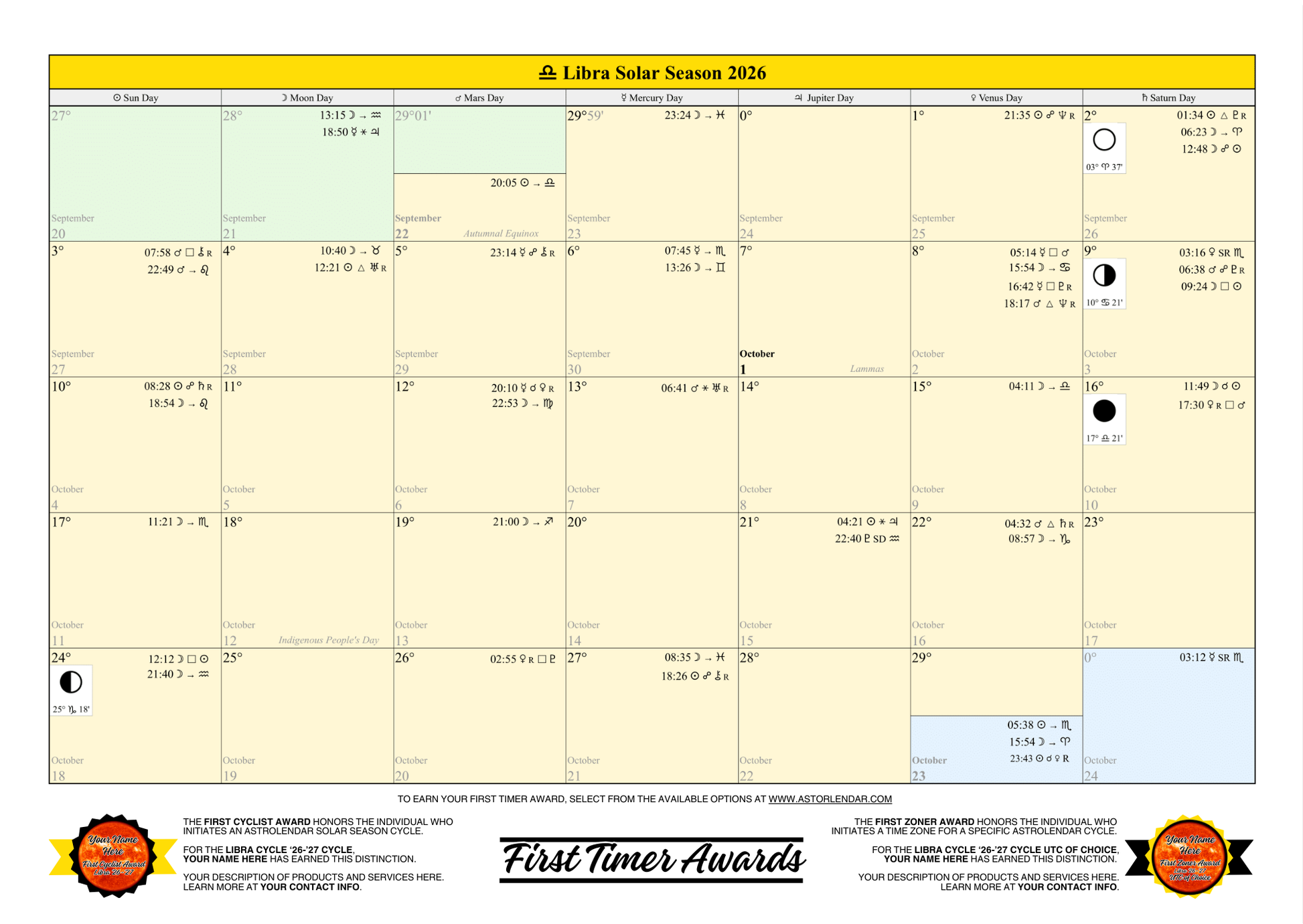 🏆 First Zoner Award: Awarded on all Libra Cycle '26-'27 Astrolendars for your selected Time Zone.
