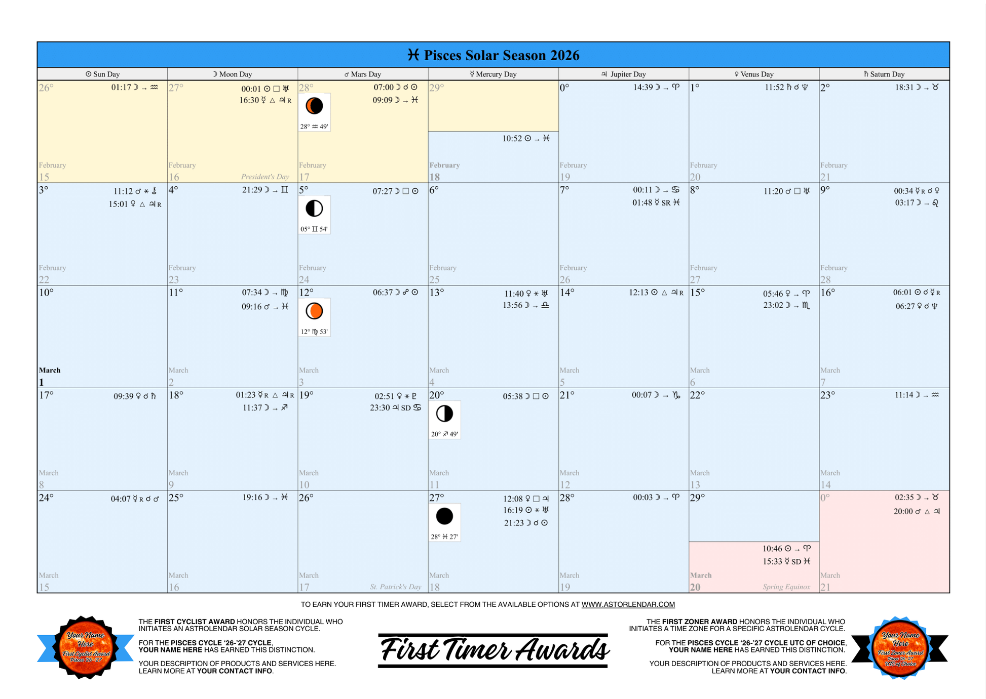 🏆 First Zoner Award: Awarded on all Pisces Cycle '26-'27 Astrolendars for your selected Time Zone.
