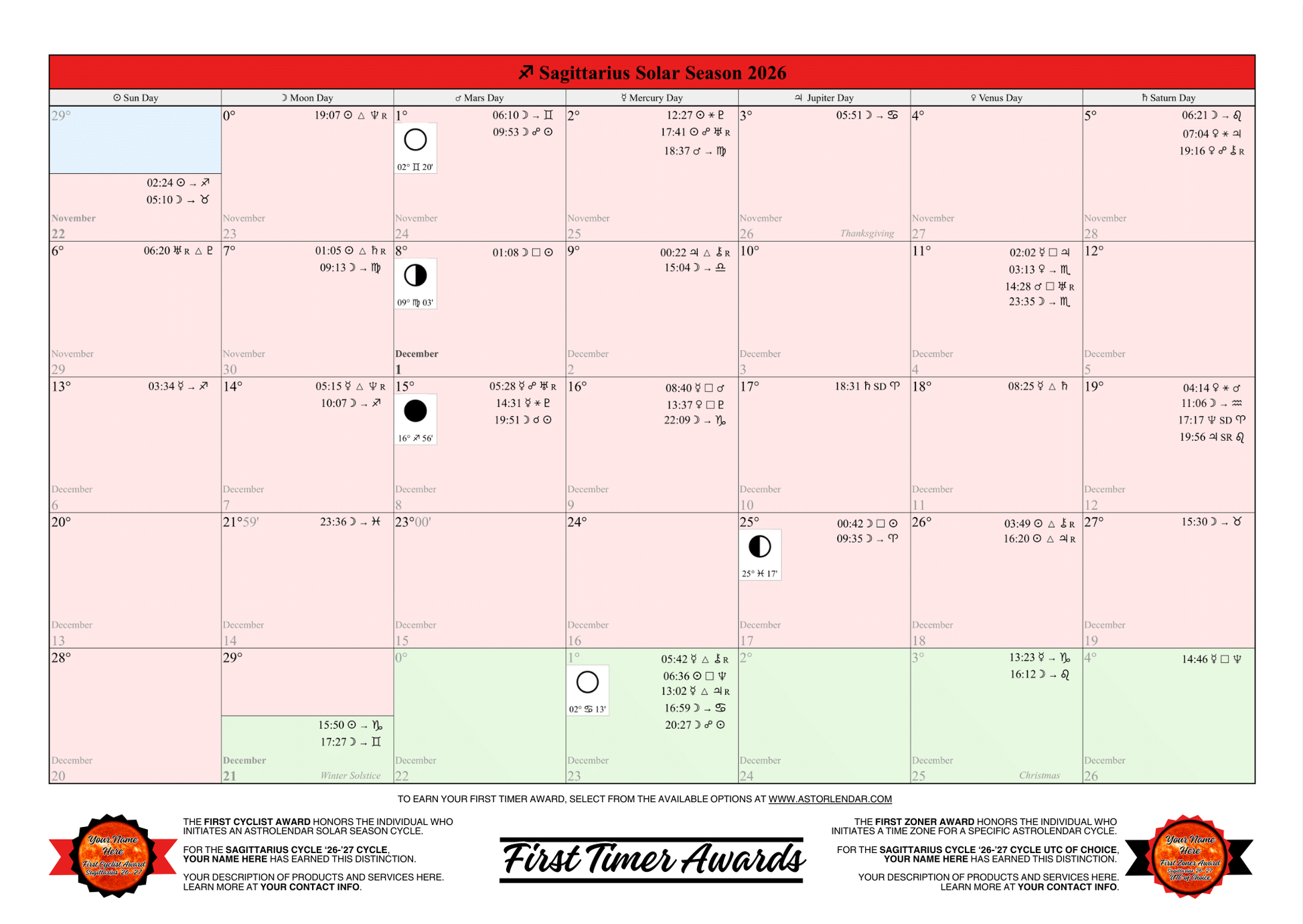 🏆 First Zoner Award: Awarded on all Sagittarius Cycle '26-'27 Astrolendars for your selected Time Zone.