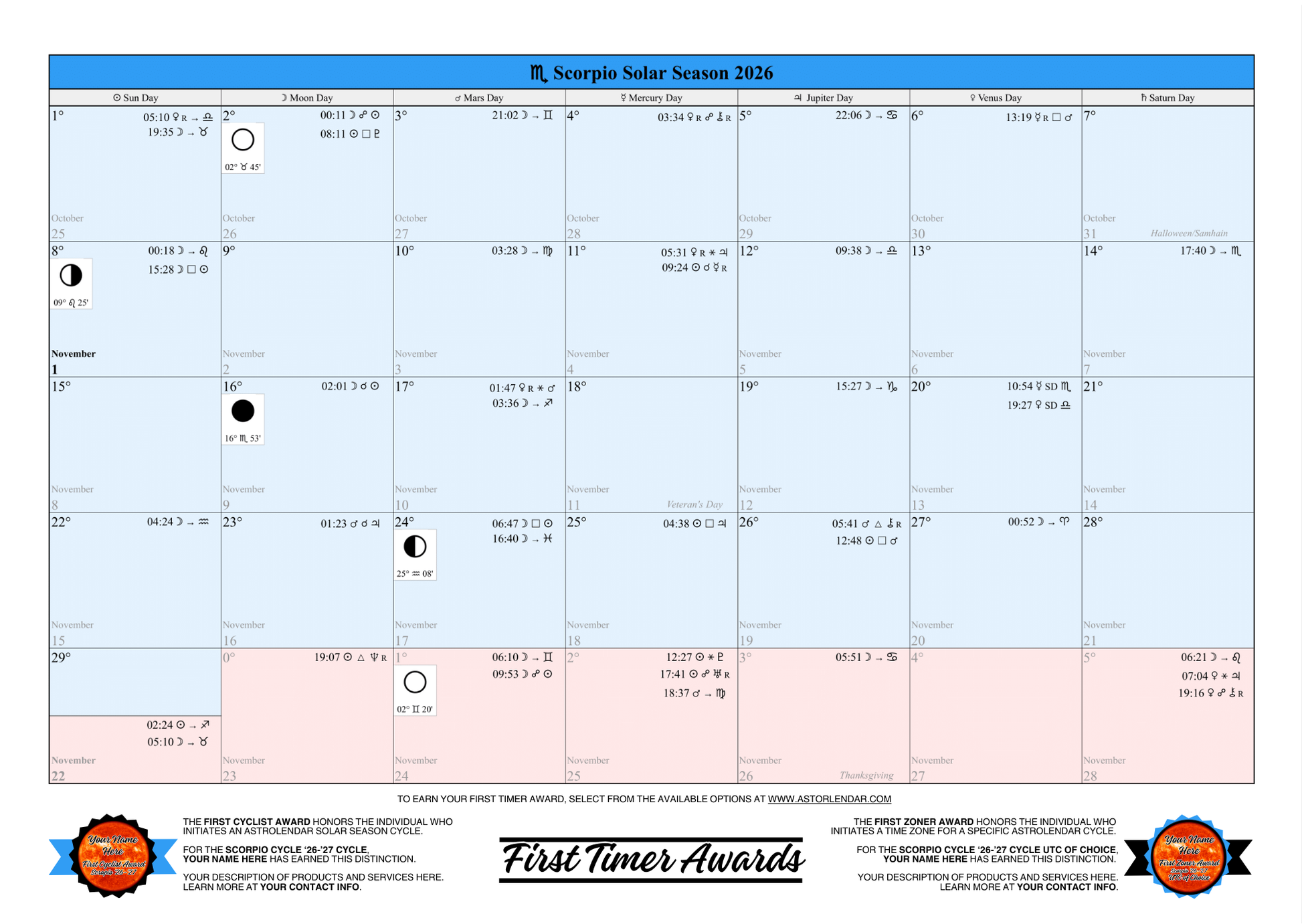 🏆 First Zoner Award: Awarded on all Scorpio Cycle '26-'27 Astrolendars for your selected Time Zone.