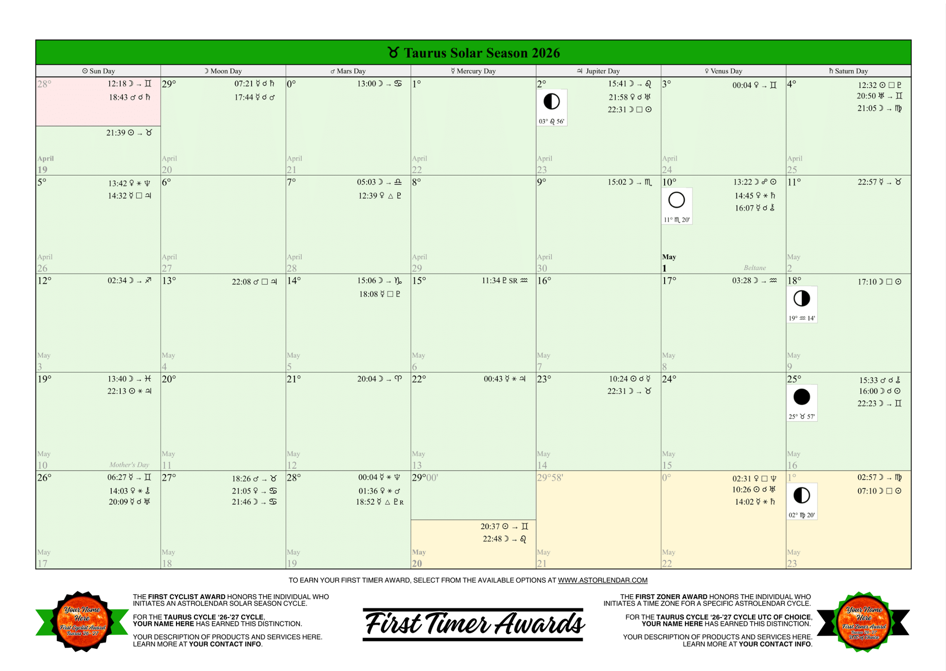 🏆 First Zoner Award: Awarded on all Taurus Cycle '26-'27 Astrolendars for your selected Time Zone.