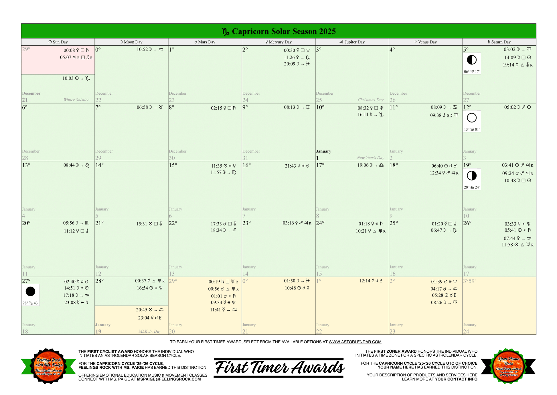 🏆 First Zoner Award: Awarded on all Capricorn Cycle '25-'26 Astrolendars for your selected Time Zone.